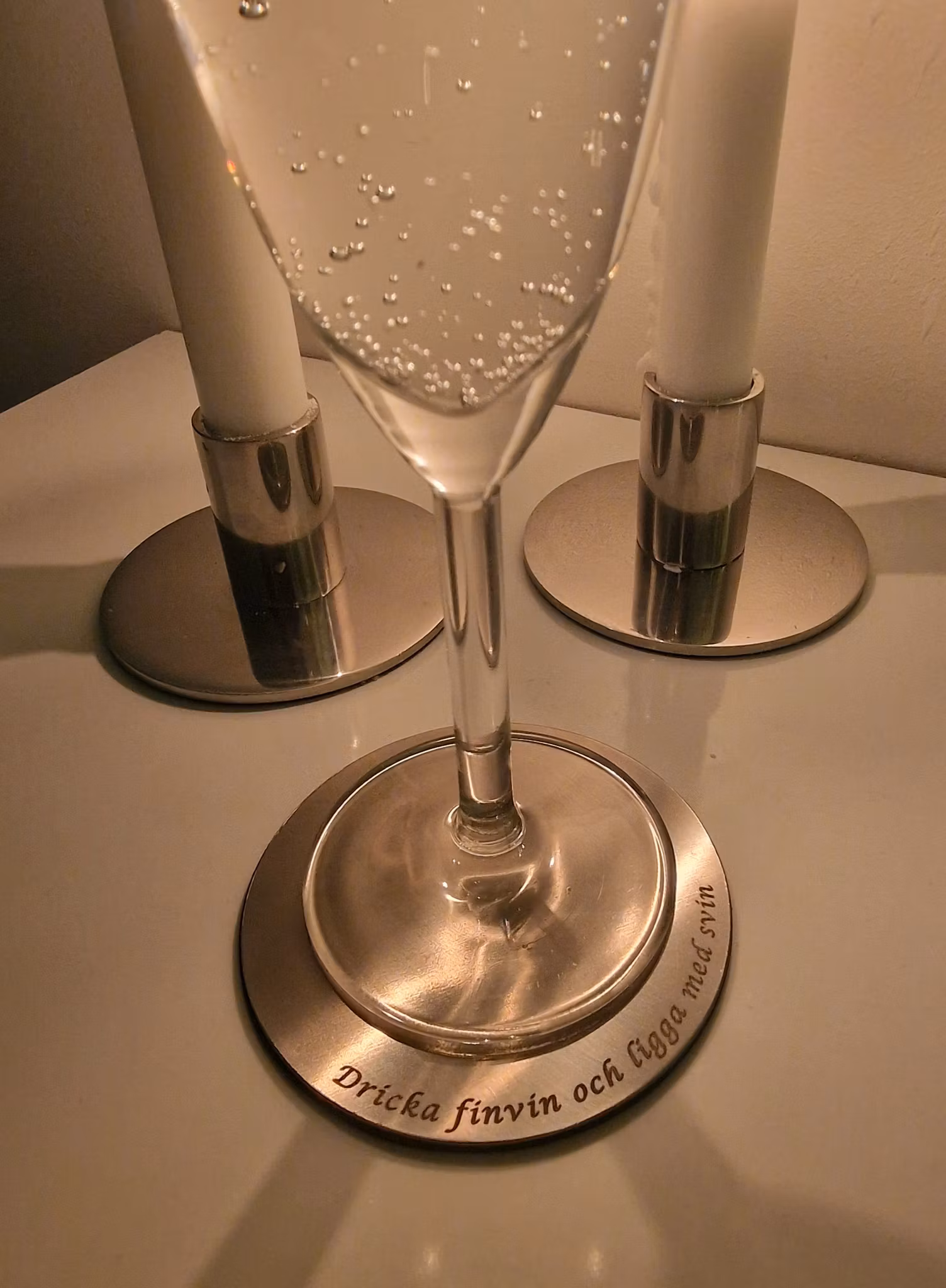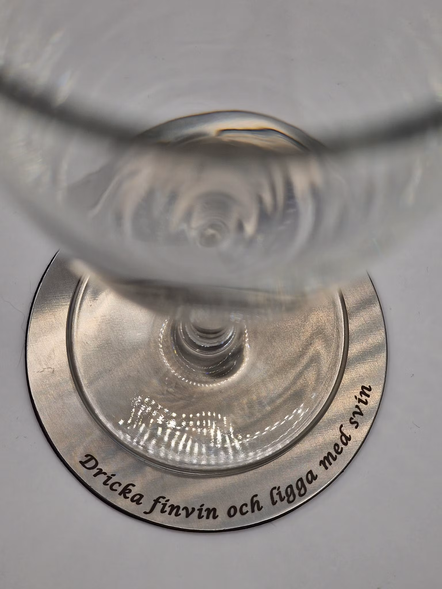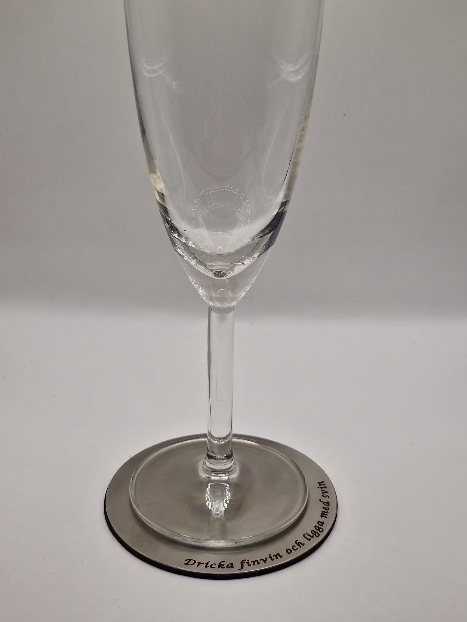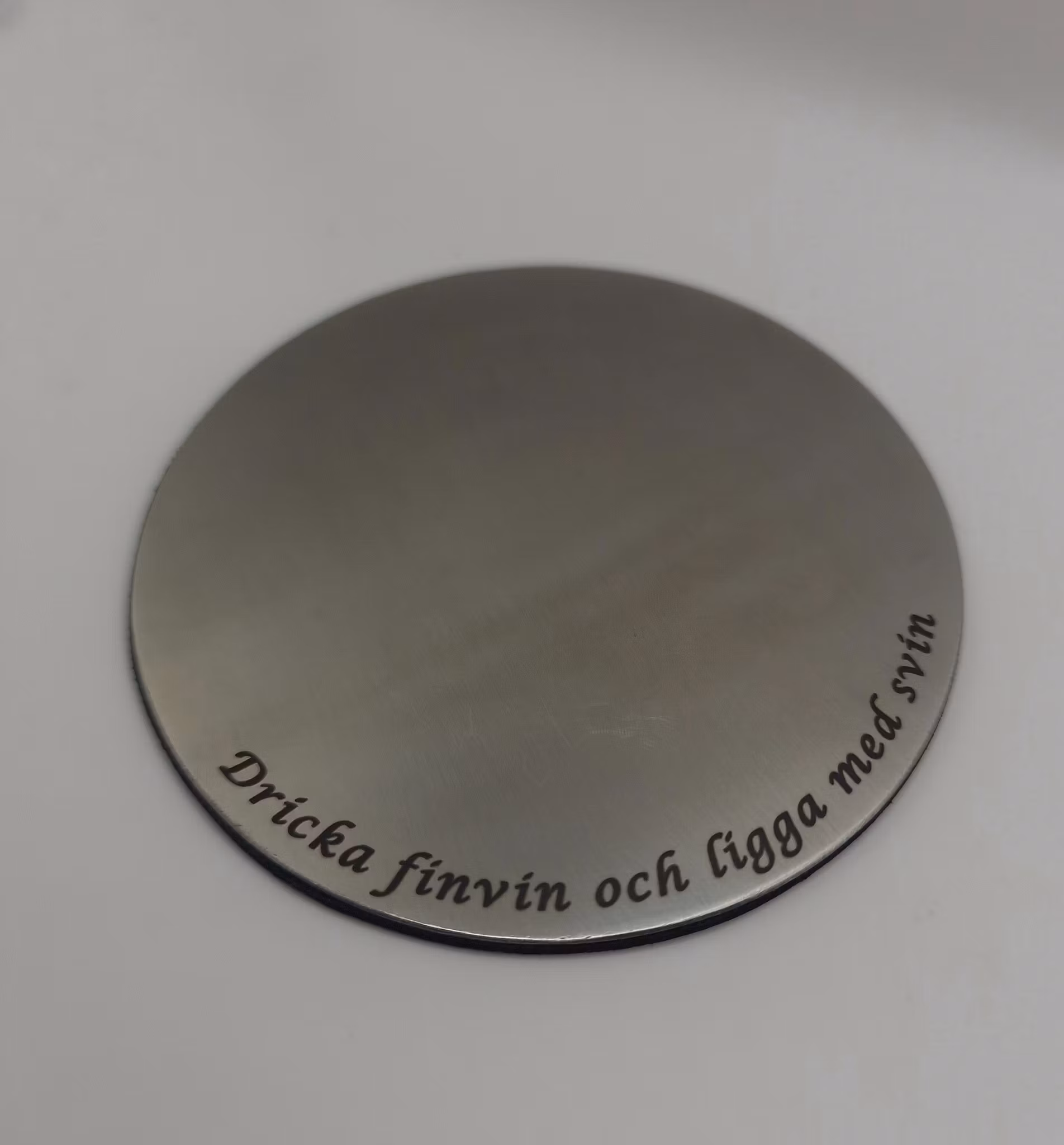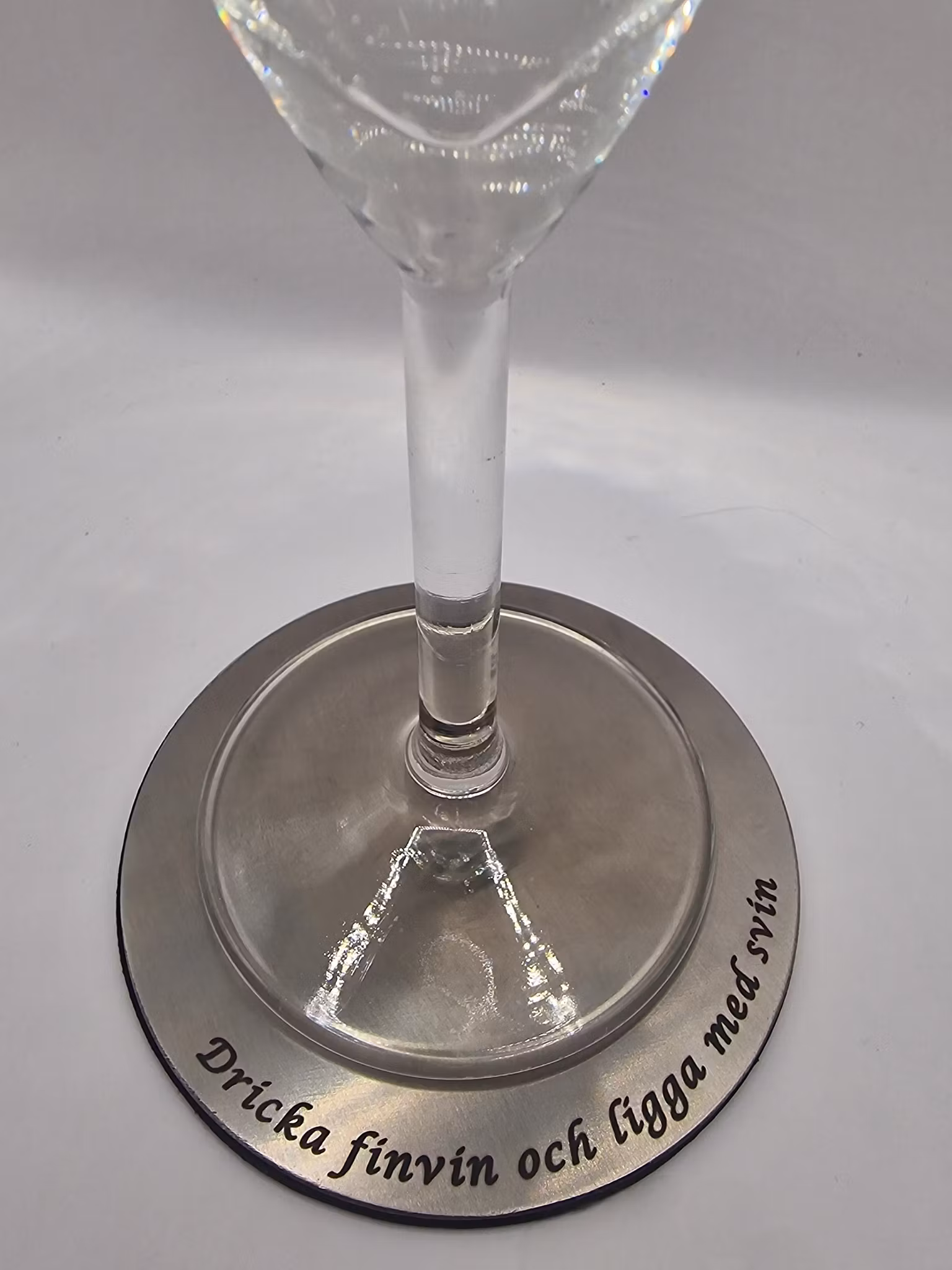 Ett stilrent underlägg i rostfritt stål! Välj själv vilken text som ska graveras längs kanten. Teckensnitt och storlek som på bilden. Dessa bokstäver är mindre än vår andra variant av graverat underlägg vilket passar bra om du vill gravera längre citat eller texter.