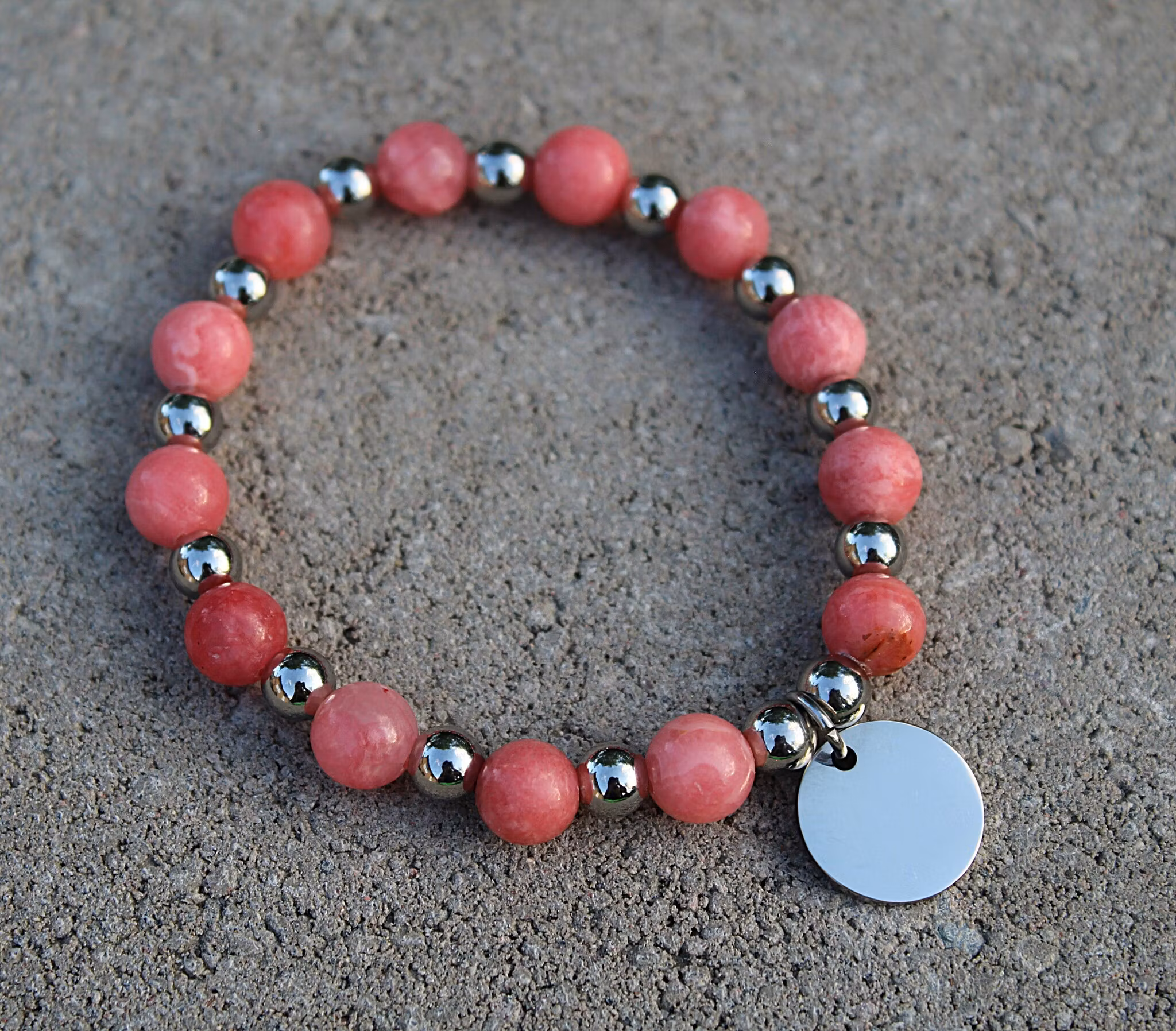 Armbandet har en elastisk tråd för att passa alla handleder. Pärlorna är av otroligt fin kvalitet i form av äkta halvädelstenar och kirurgiskt stål. Taggen är av rostfritt stål - inga missfärgningar eller repor alltså! Armbandet har lite tyngd vilket ger en fin känsla när man bär det.