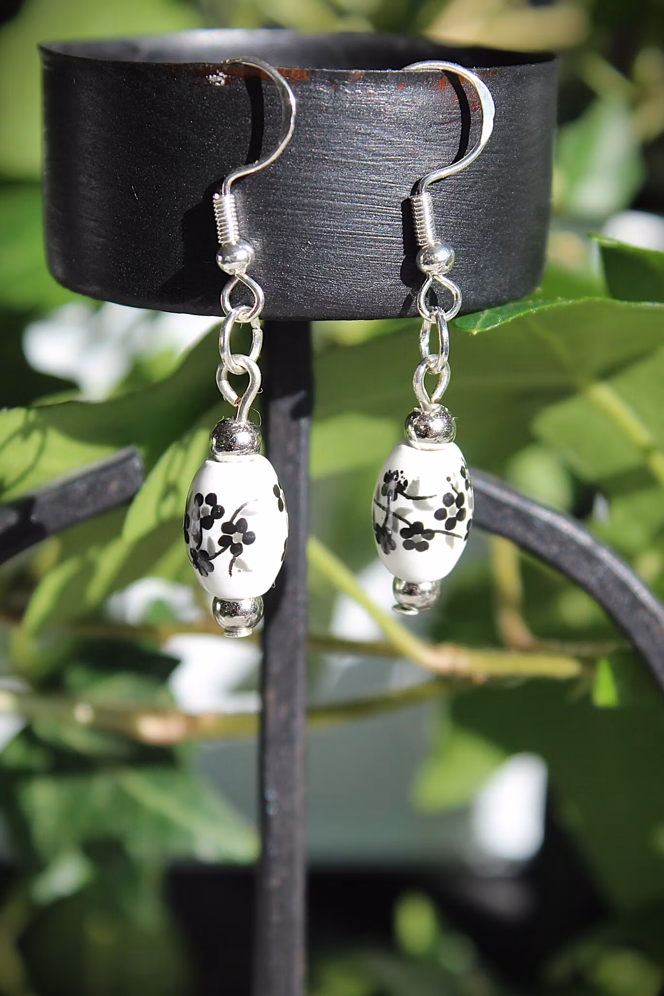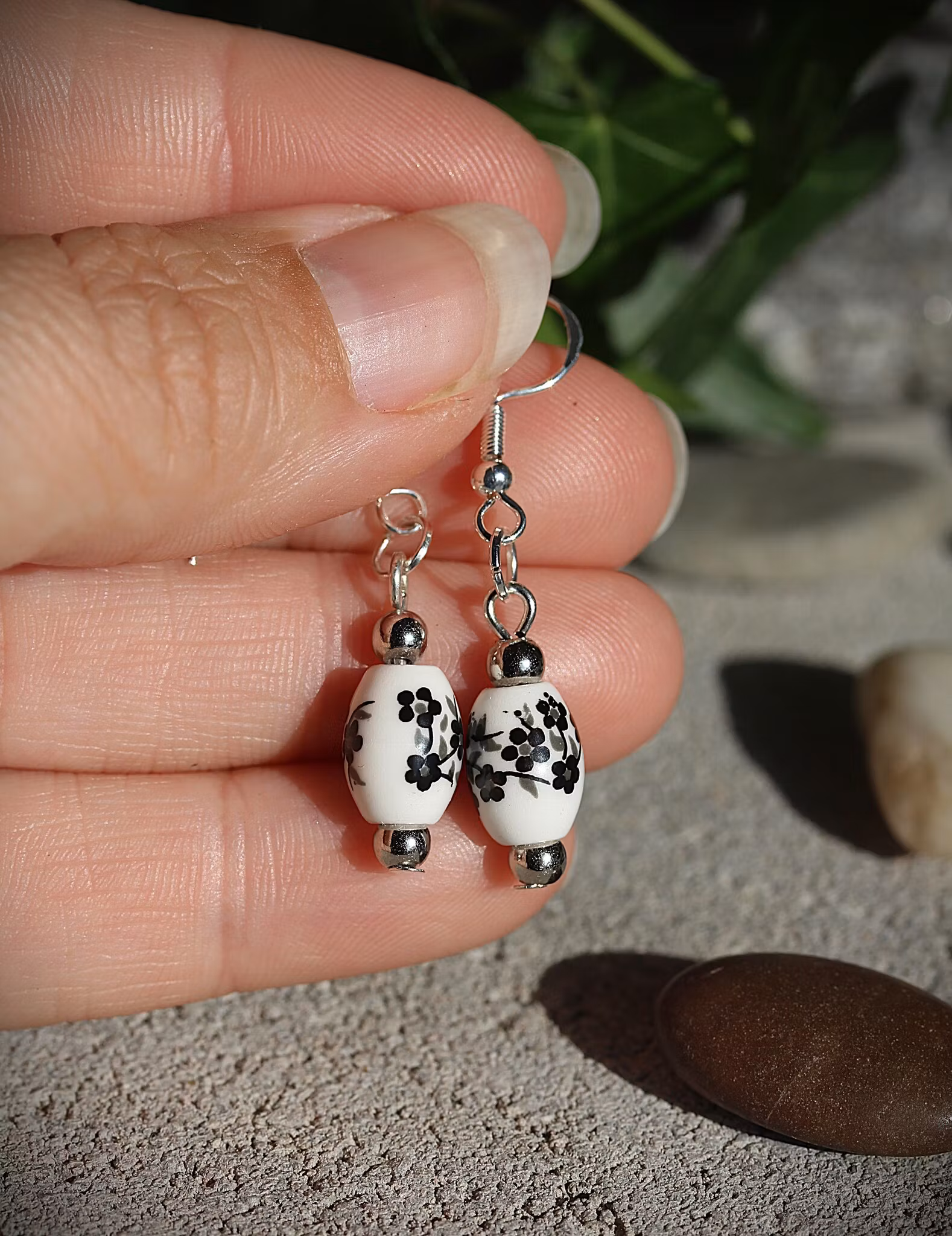 Handgjorda örhängen med hängen av keramik. Dekorerade med svarta blommor.