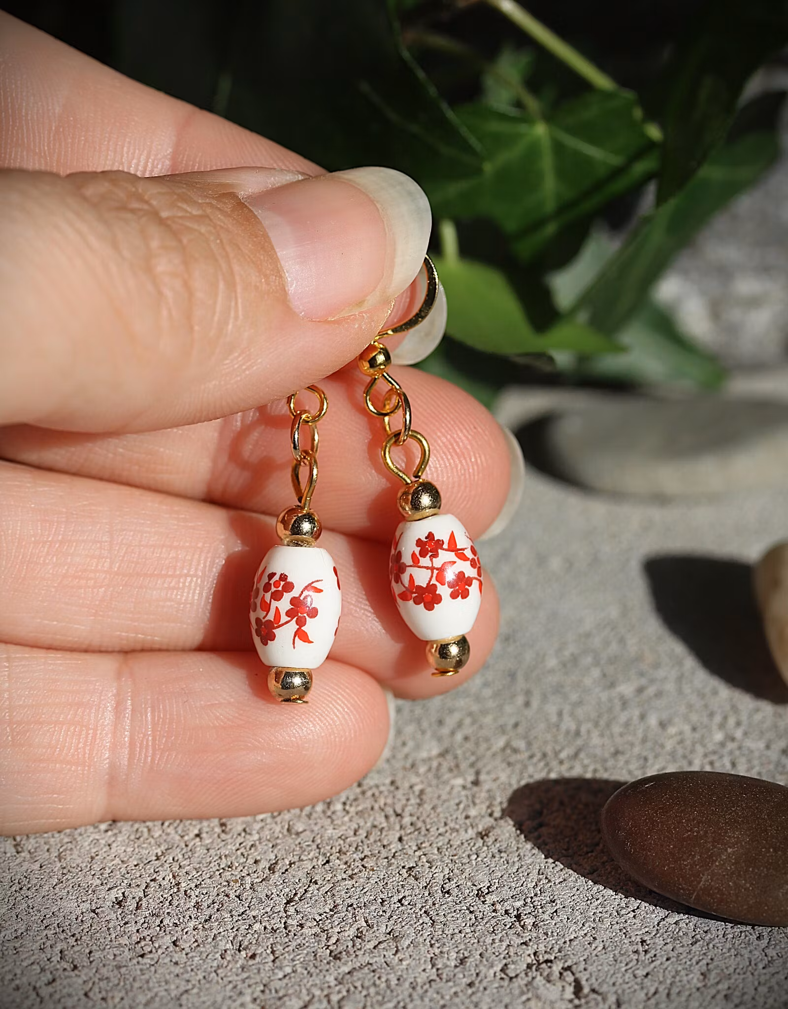 Handgjorda örhängen med hängen av keramik. Dekorerade med röda blommor.