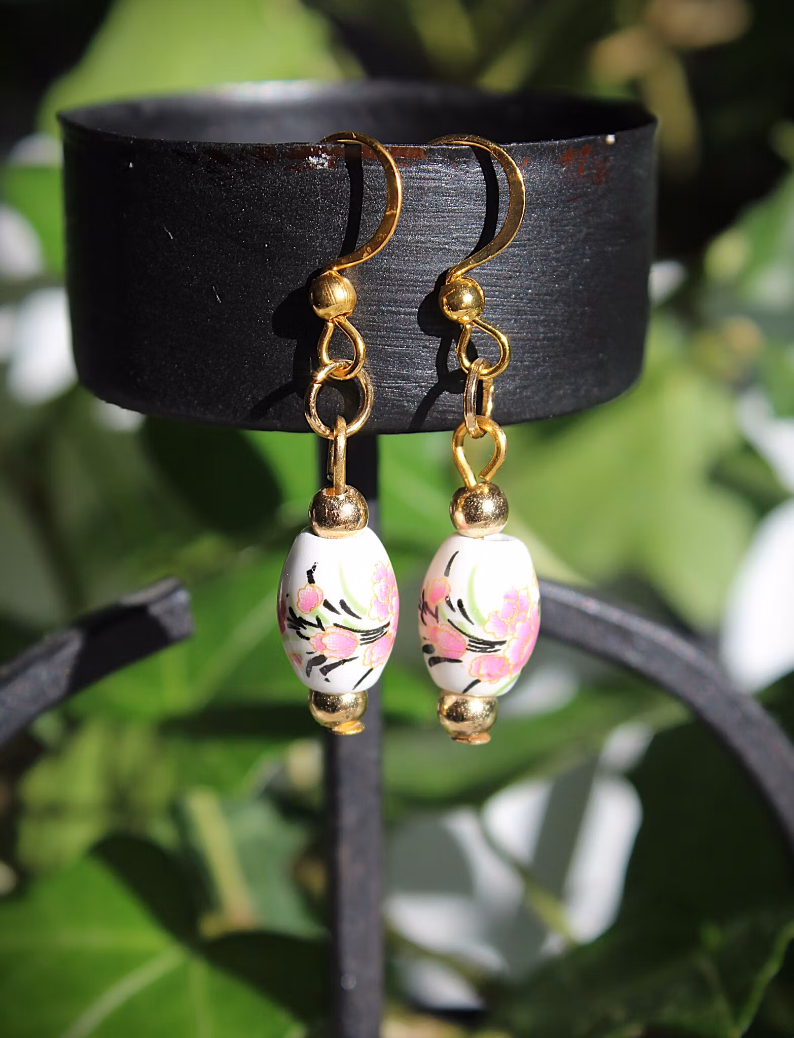 Handgjorda örhängen med hängen av keramik. Dekorerade med rosa blommor och svarta strimmor.