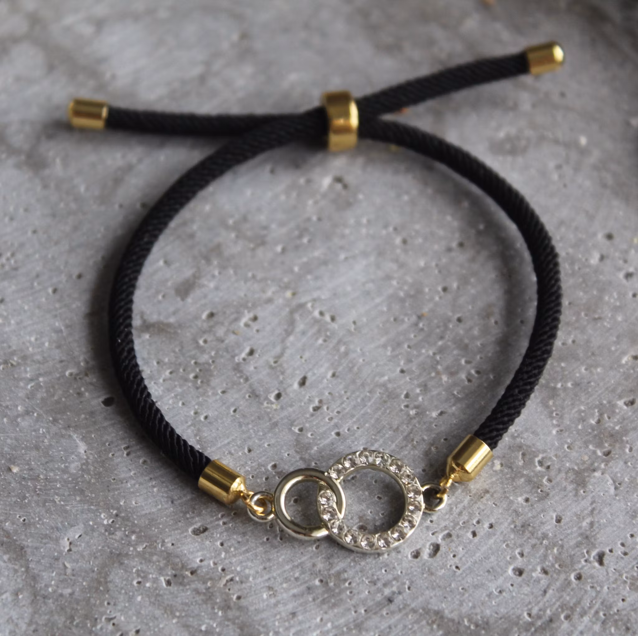 Ett handgjort ihopsatt armband i svart repband med guldfärgade detaljer och en berlock i form av två sammanlänkade cirklar. Cirklarna är dekorerade med cubic zirconia för en diskret glans.