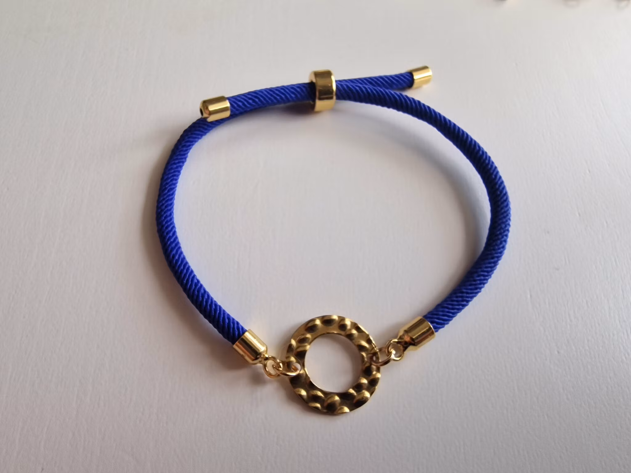Ett handgjort ihopsatt armband i klarblått repband med guldfärgade detaljer och en berlock i form av en hamrad cirkel.