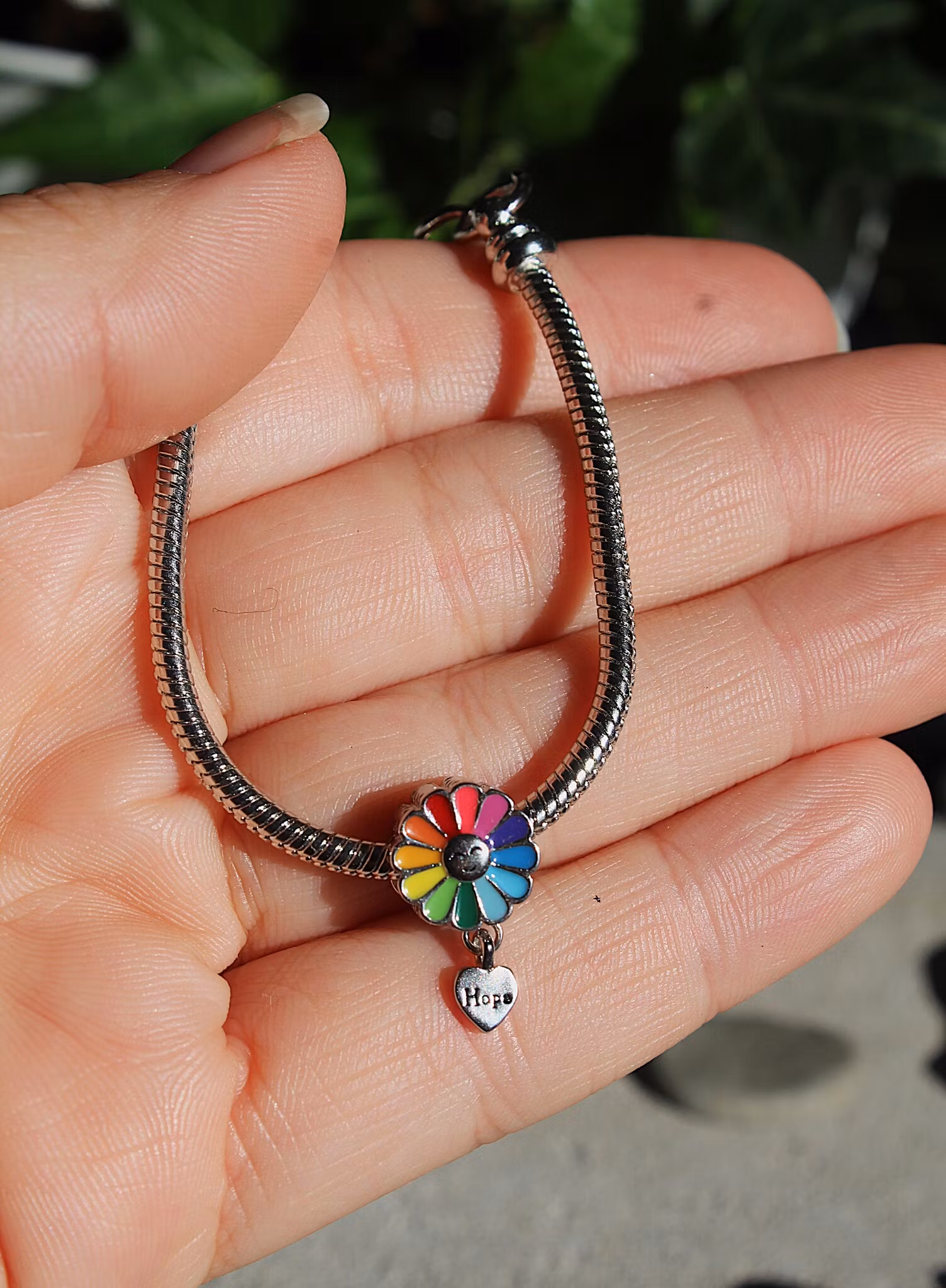 Ett handgjort ihopsatt ormlänksarmband med en regnbågsblomma och ett hjärta med texten Hope. Berlocken är av metall och ger ett mycket kvalitativt intryck.