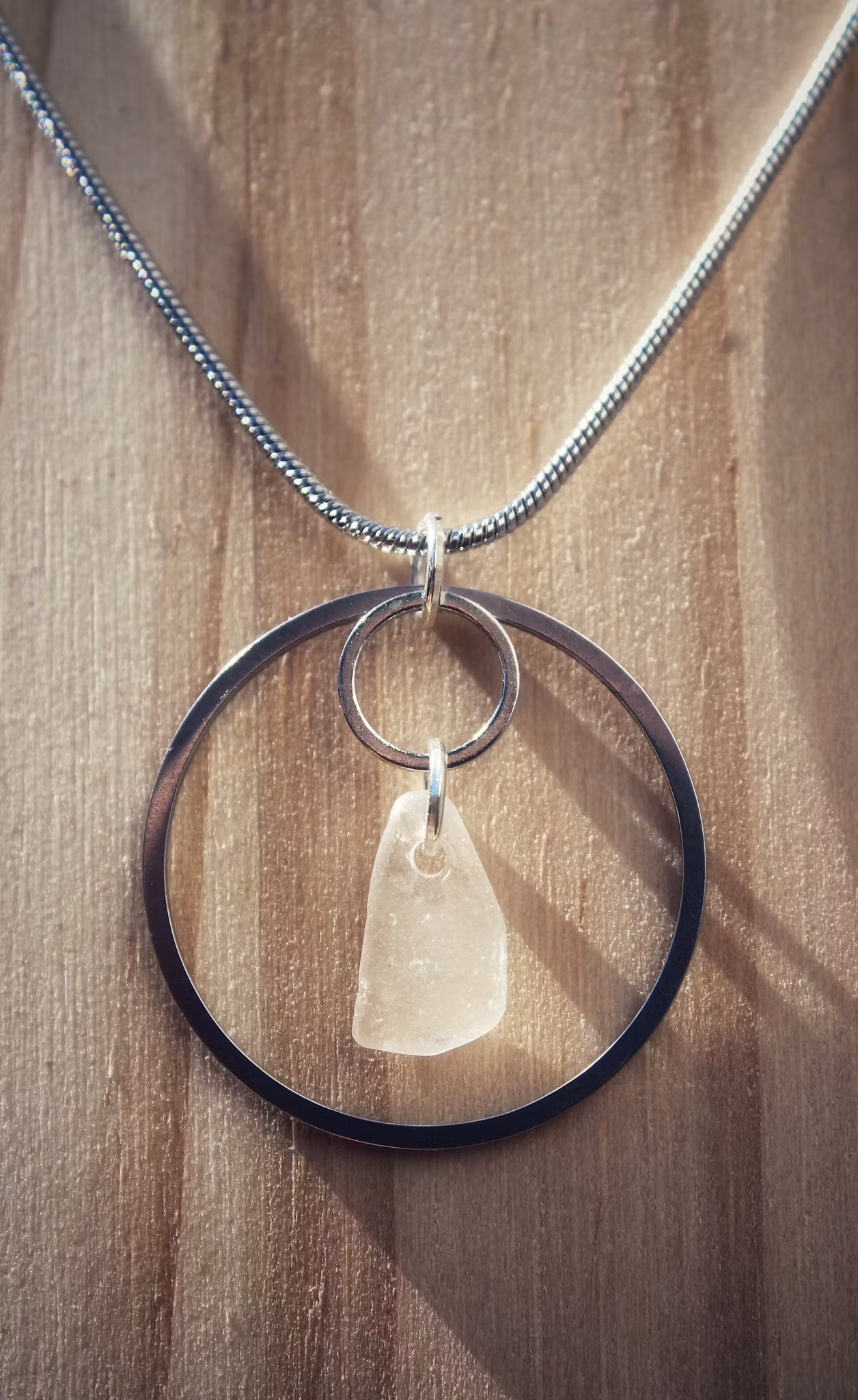 En mjukt slipad bit strandglas, formad av havet och polerad av tidens gång. Här, omsorgsfull omringad av en cirkel i rostfritt stål.