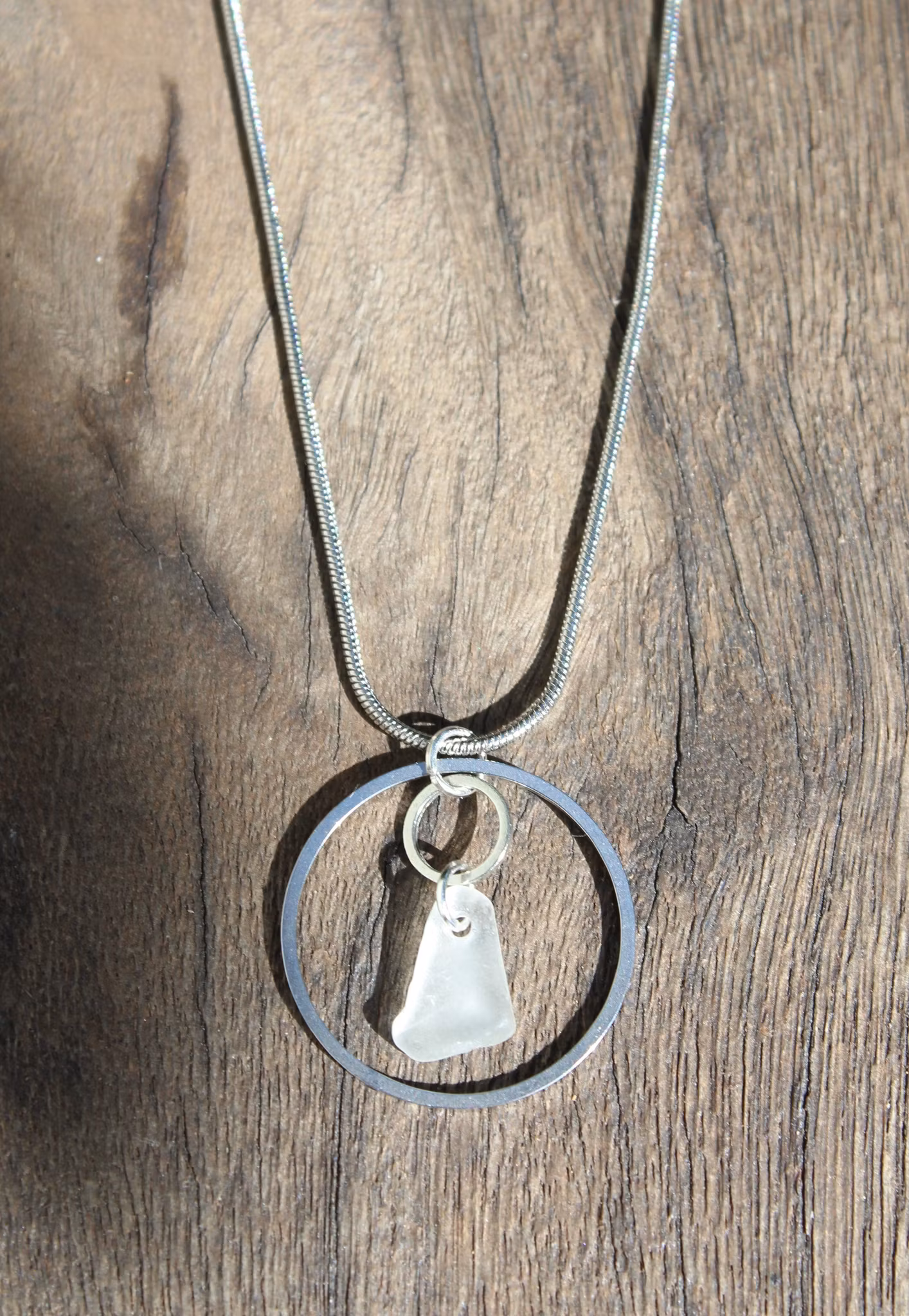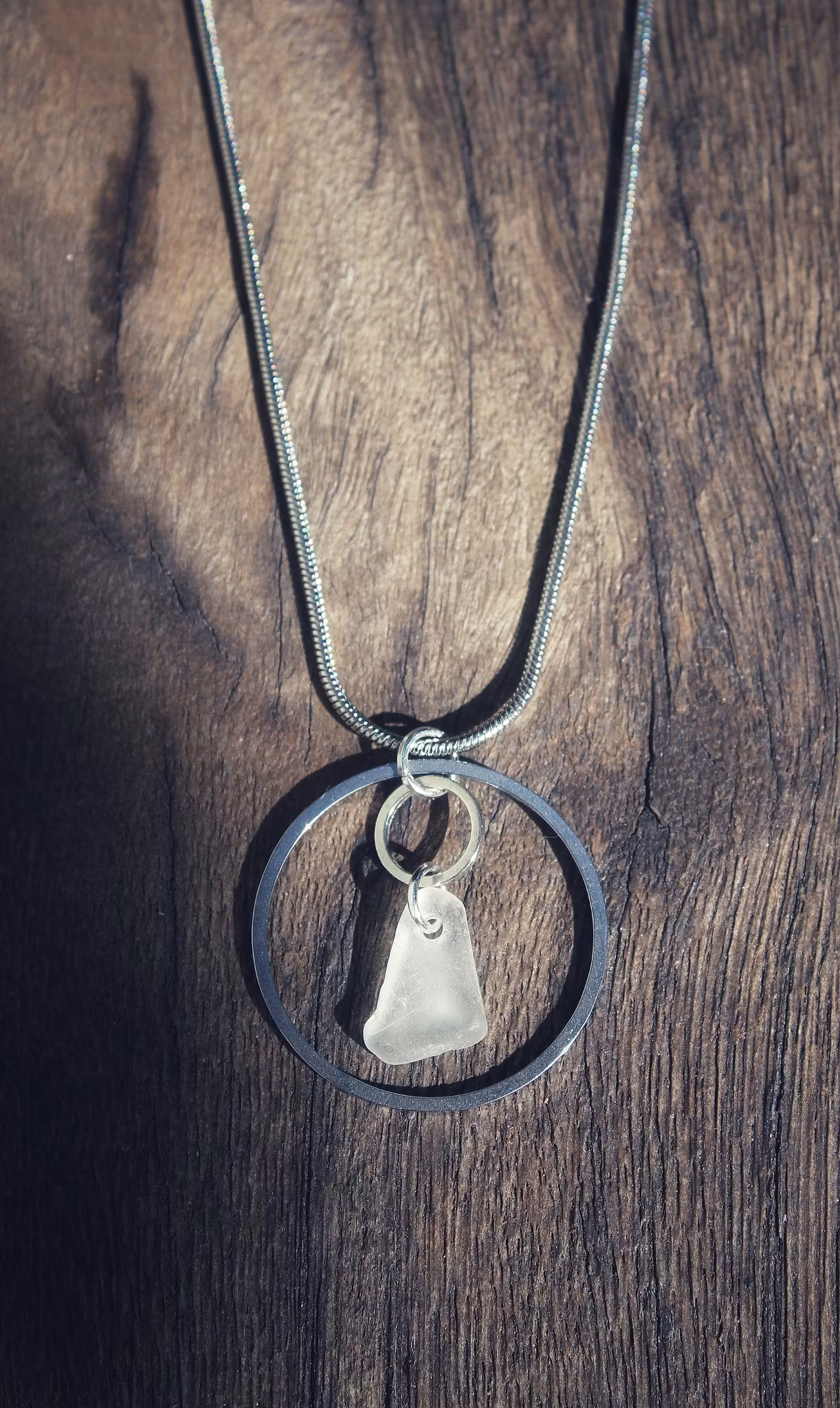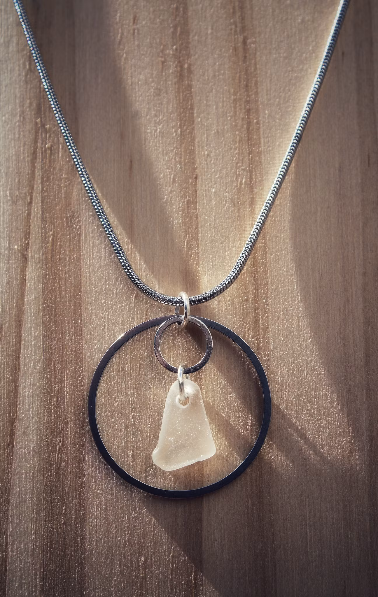 En mjukt slipad bit strandglas, formad av havet och polerad av tidens gång. Här, omsorgsfull omringad av en cirkel i rostfritt stål.
