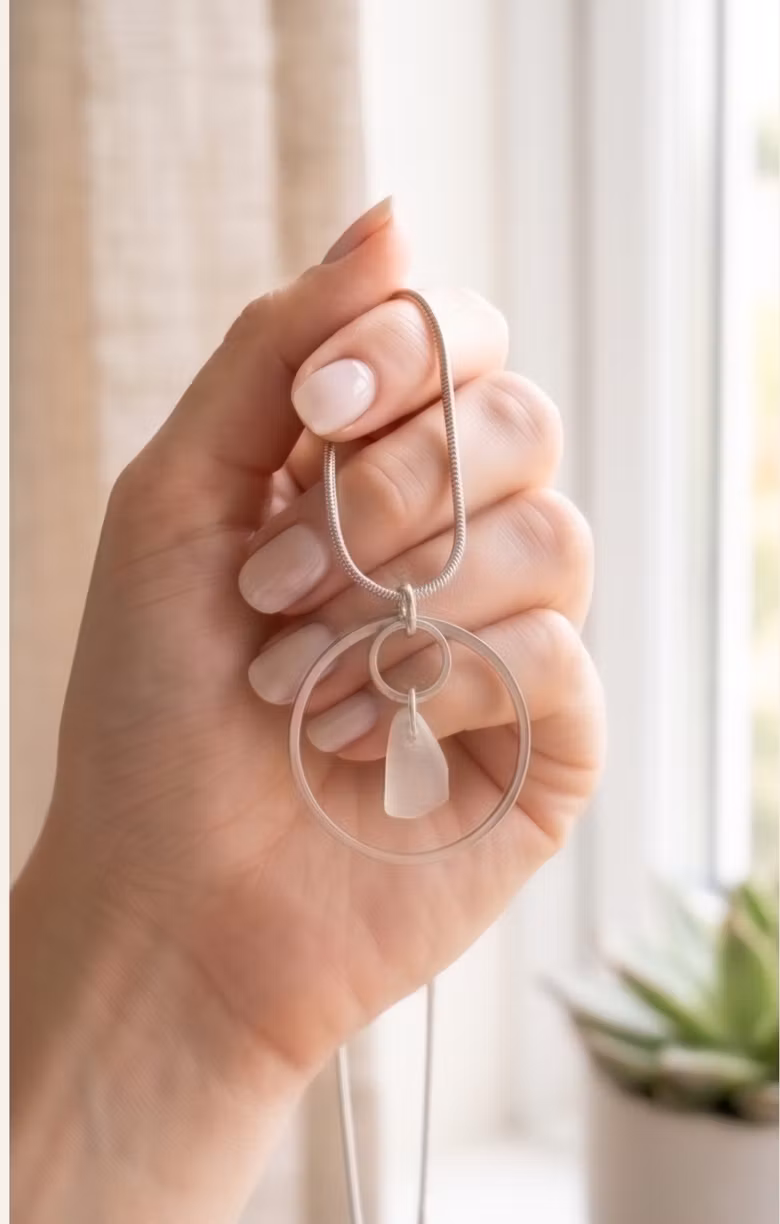 En mjukt slipad bit strandglas, formad av havet och polerad av tidens gång. Här, omsorgsfull omringad av en cirkel i rostfritt stål.